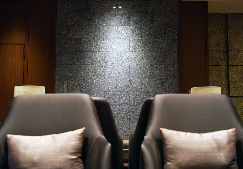 エントランスを入り、すぐ右側には、あまり見たことのない大理石が壁一面を覆う。「コレニア大理石と呼ばれています。約6億年前の藻の化石が渦巻き模様になっています」。初代ではロビーの柱の建材として使われていた。2代目では、11階と12階のエレベーターの横の壁の大部分を占めていた。「現在では大変珍しく貴重な大理石と言われています」。建築好きな人が、遠方から見にくることもあるという。