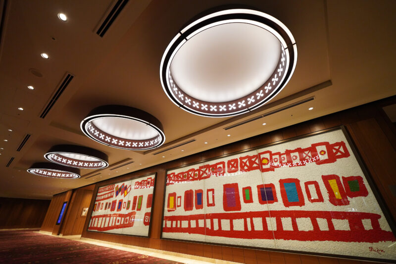 正面玄関から見えるエレベーターの先にある壁には、2代目建物にあった、約9万ピースのモザイクを使った「都市・窓」(洋画家・猪熊弦一郎作)という壁画作品が飾ってある。その前の廊下を照らすのは、レプリカではあるが、円形をしたモダンなシャンデリア「金環」(同)だ。花の模様もそのまま再現してある。「建て替えて新しくなりましたが、『また戻って来たんだね』『東京會舘は変わらないんだな』と思っていただけるような懐かしさを残しています」