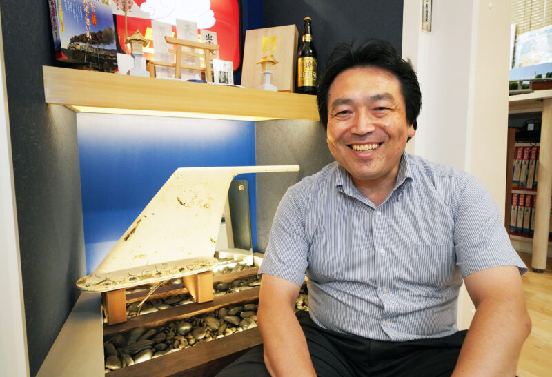 「時刻表神社」の前に座る鈴木館長。時刻表の話をする時、うれしそうな表情になる。下の棚の白い物体は、0系新幹線の「ツノ」(静電アンテナ)の実物