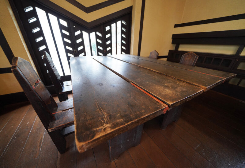時を経た木の匂いがしてくるような、当時使われていたテーブルが残っていた。昔あったはずのぬくもりさえ感じささせる