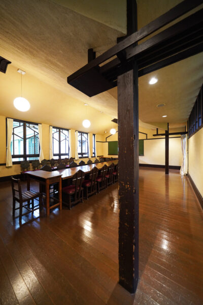 ライトの弟子である遠藤新の設計した講堂。1927(昭和2)年に完成した。97(平成9)年には、中央棟、東西教室棟、講堂が国の重要文化財に指定された