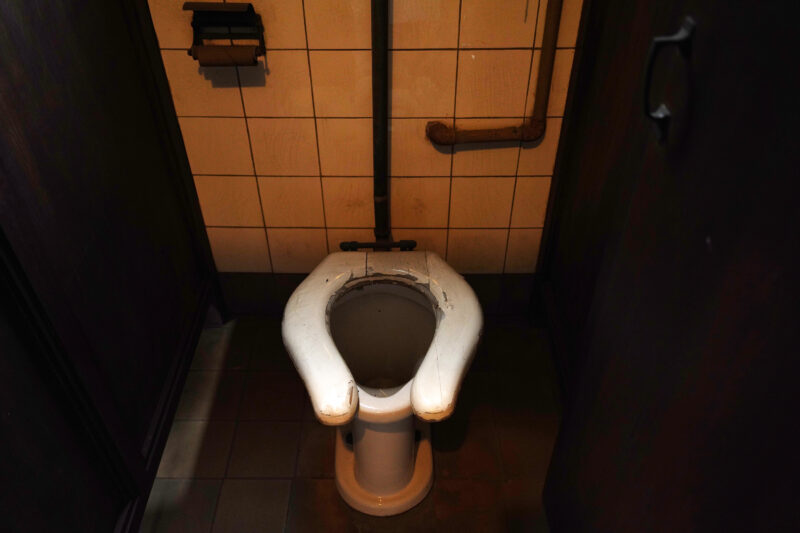 保存修理工事の時に発見された、当時のトイレ。洋式だが、流すのは昔から日本にあるひもを引っ張るタイプだ
