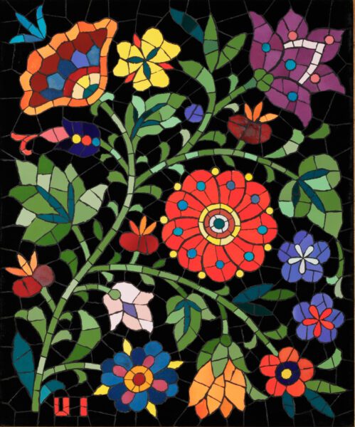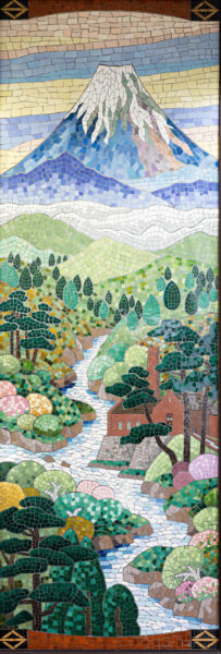 近代陶芸の巨匠・板谷波山(1872ー1963)を父にもつ梅樹は、波山が砕いた陶片に魅了され、陶片を使ったモザイク画の制作を志した。1933(昭和8)年には、旧日本劇場(日劇)玄関ホールに代表作となる高さ3㍍の巨大なモザイク壁画(原画・川島理一郎)を制作した。20代半ばの頃だった。同特別展では、54年(同29)年に制作された現存する最大の壁画「三井用水取入所(みいようすいとりいれじょ)風景」の他、瀟洒(しょうしゃ)な飾り箱や飾り皿、帯留め、ペンダントヘッドなどに絵画や模様を表出した独自のエキゾチックなモザイク作品などを展示。いずれも清新な色彩と可憐な意匠に満ちている。また、住友コレクションの板谷波山の作品も展示しており、梅樹との父子競演も。