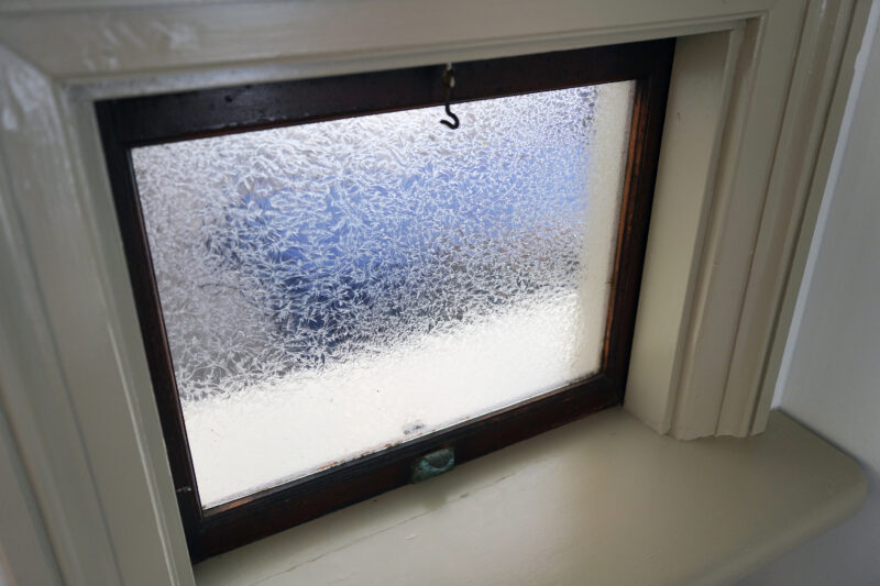 キッチンとダイニングをつなぐガラスの窓。ここから湯気を立てた洋食が供されたと思われる。ここだけでなく、ドアやガラスを囲う木製の枠には装飾が施されている