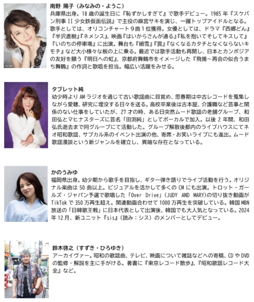 6カ所のうち4カ所以上のスタンプを集めると、抽選で60人を 3月15日に開催するスペシャルイベントに招待。鈴木氏のトークを中心に、スペシャルゲストに「昭和のアイドル四天王」のひとり南野陽子さん、ムード歌謡漫談のタブレット純さん、ギターの弾き語りでライブを行う歌手・かのうみゆさんが出演する 歌ありトークありの昭和歌謡満載のイベントだ。