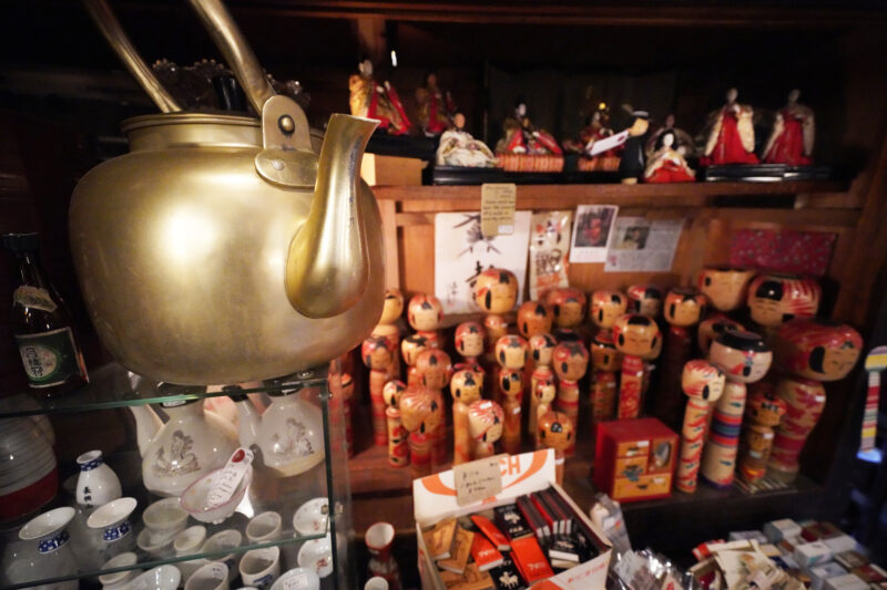 どデカイやかんとこけしやひな人形の共演。思わず目に入ってしまう光景だ