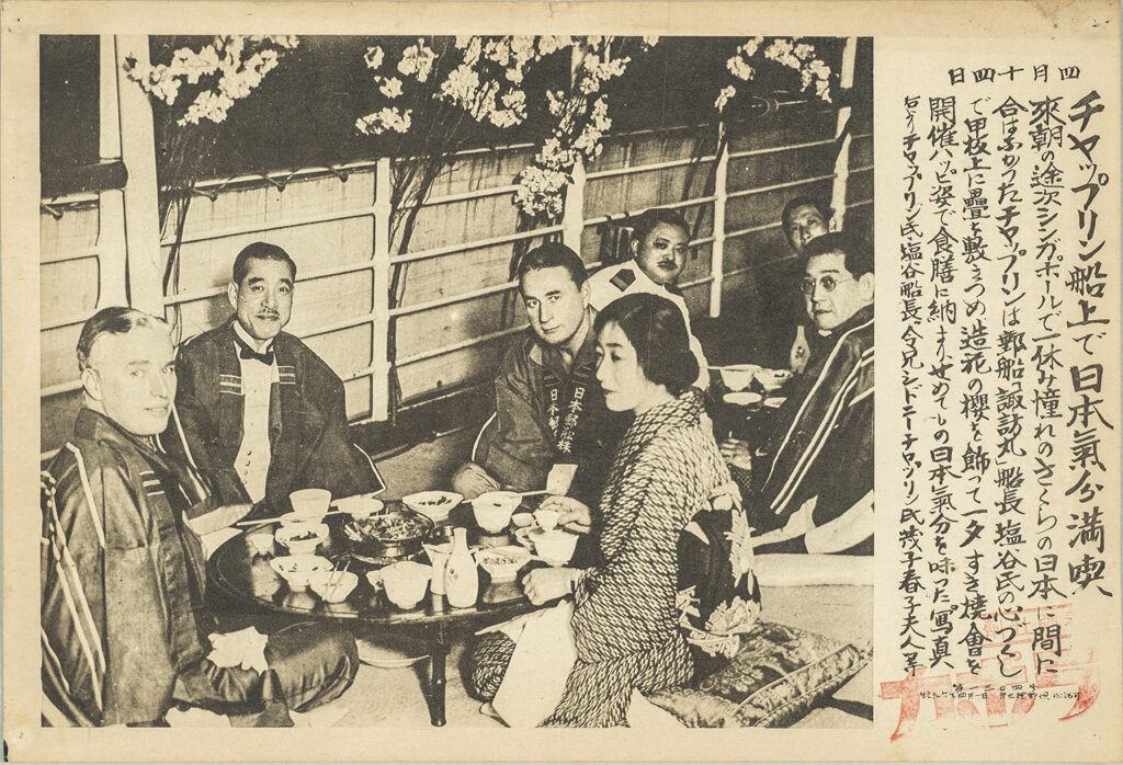 チャップリン船上で日本気分満喫=チャールズ・チャップリンは昭和7(1932)年5月14日、兄のシドニーと秘書の高野虎市を伴い、日本郵船照国丸で神戸に初来日。この写真ニュースは来日の約1ヶ月前の4月14日、シンガポールに寄港した時の撮影である。左よりチャップリン、塩谷船長、兄のシドニー。右端のメガネの男性が、信頼され運転手から秘書となった高野虎市であろう。(昭和7年4月14日、時事写真速報)