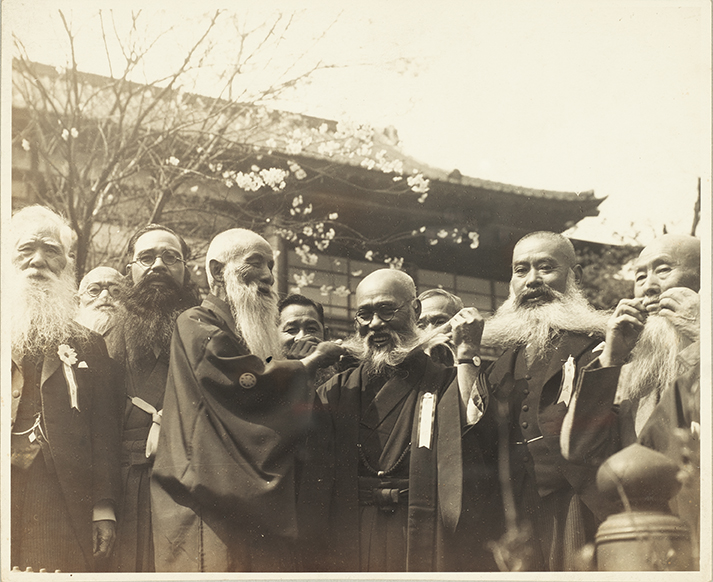 日本閣でのヒゲ自慢の会=裏面に「日本で一番髭をそらない男」と英語での解説がある。東中野駅前にあったWest53rd 日本閣は、結婚式場として有名だったが、大正9(1920)年に料亭として創業した。昭和10(1935)年に東京初の結婚式場を開設した。それから間もない頃の写真である。若いカップルだけでなくこうした髭のシニアも大切にしたことが窺(うかが)われる。春で背後に桜が咲いている。庭園には立派な建物が並んでいたが、戦災で全焼した。(昭和13年4月15日、“The Associated Press”)