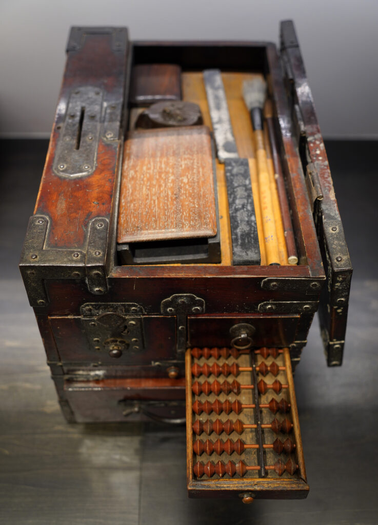そろばん付き舟箪笥(たんす)。最上部に墨・硯(すずり)・筆が入り、下部の引き出しには書類を格納できる。船中での取引で海難事故が起きても、重要な書類が守られる優れもの。堅牢(けんろう)性に優れている